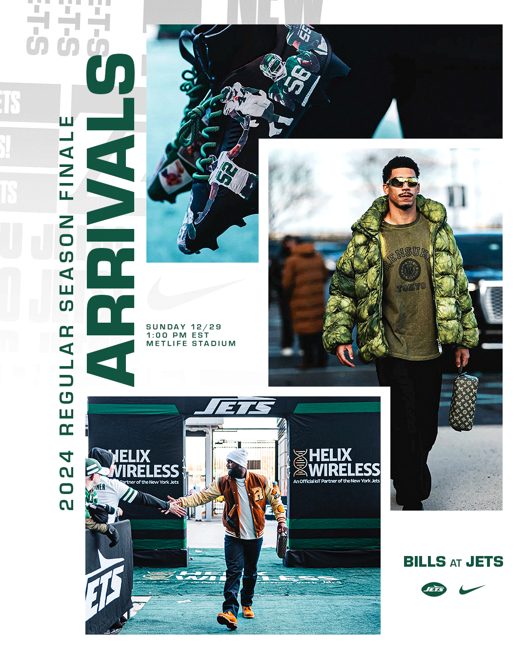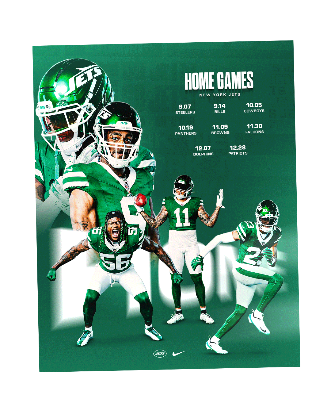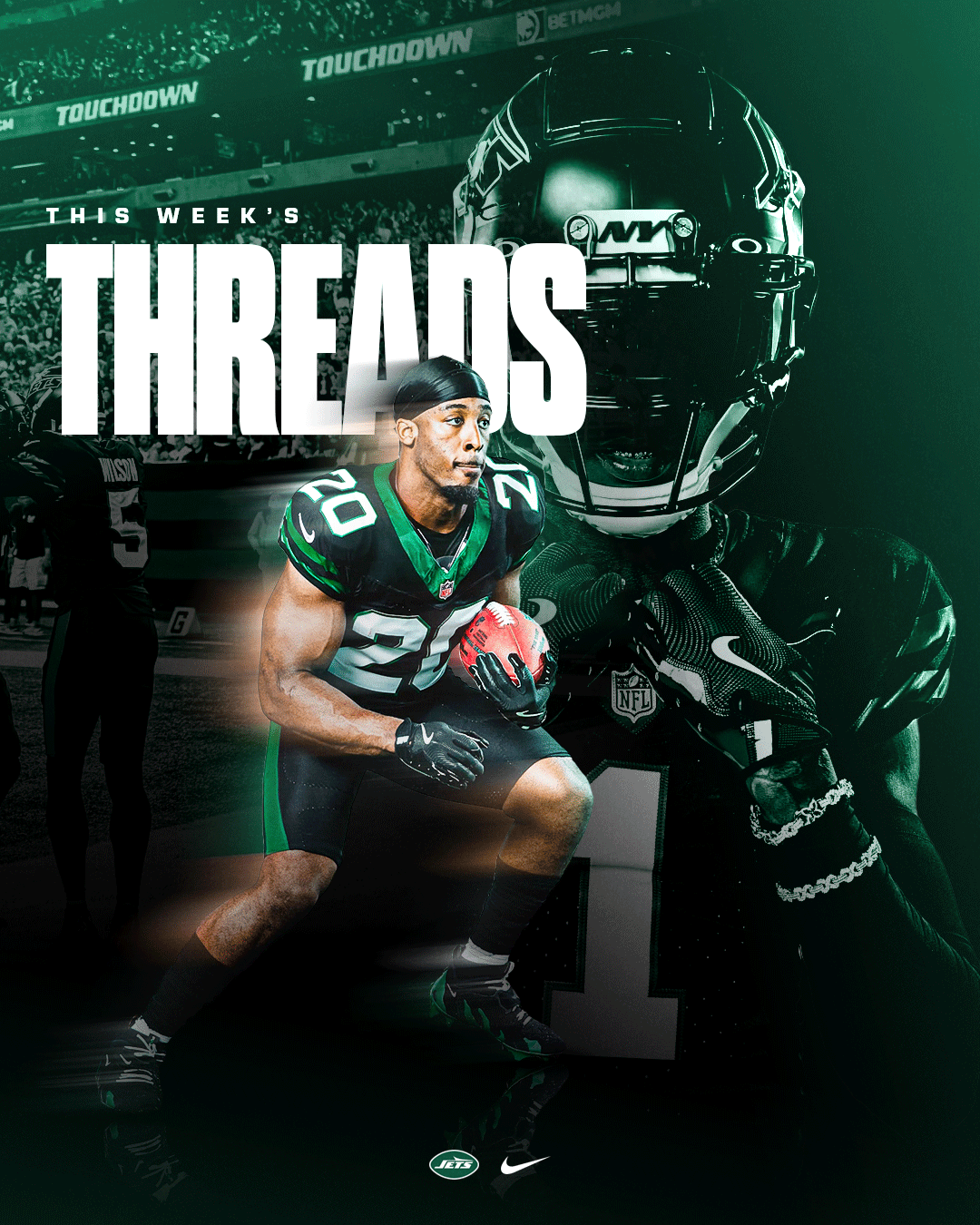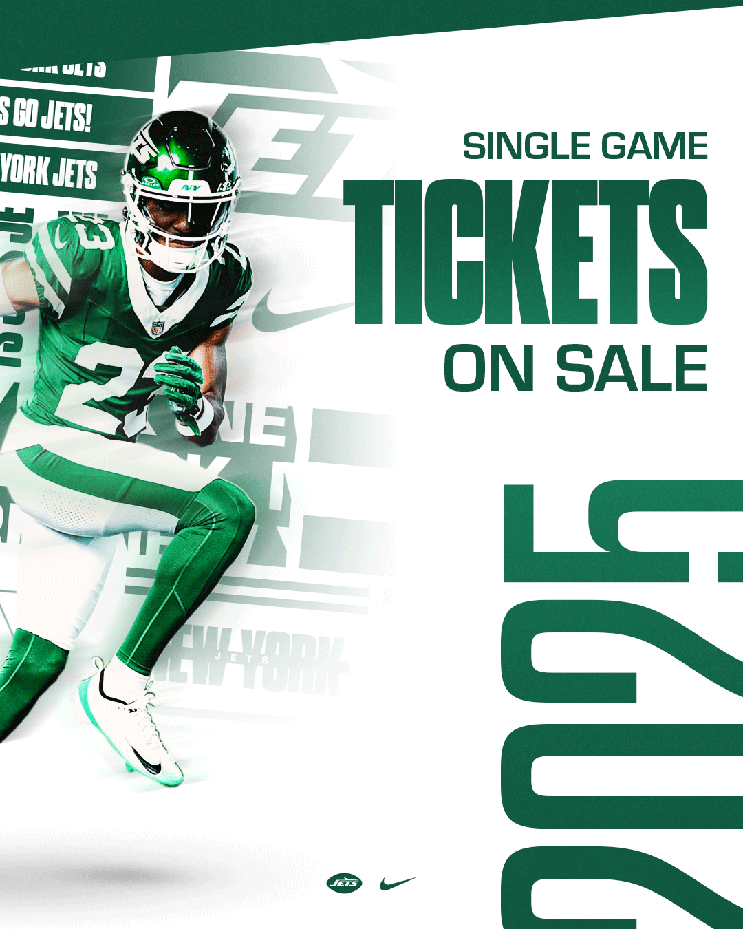 This personal project explores a refreshing and exciting aesthetic for New York Jets social media graphics. I focused on developing a cohesive visual system across the designs while ensuring each graphic remained engaging. The project aimed to balance simple and more complex designs to create contrast based on the message being communicated. The photos used were sourced from photo galleries on the New York Jets’ official website.