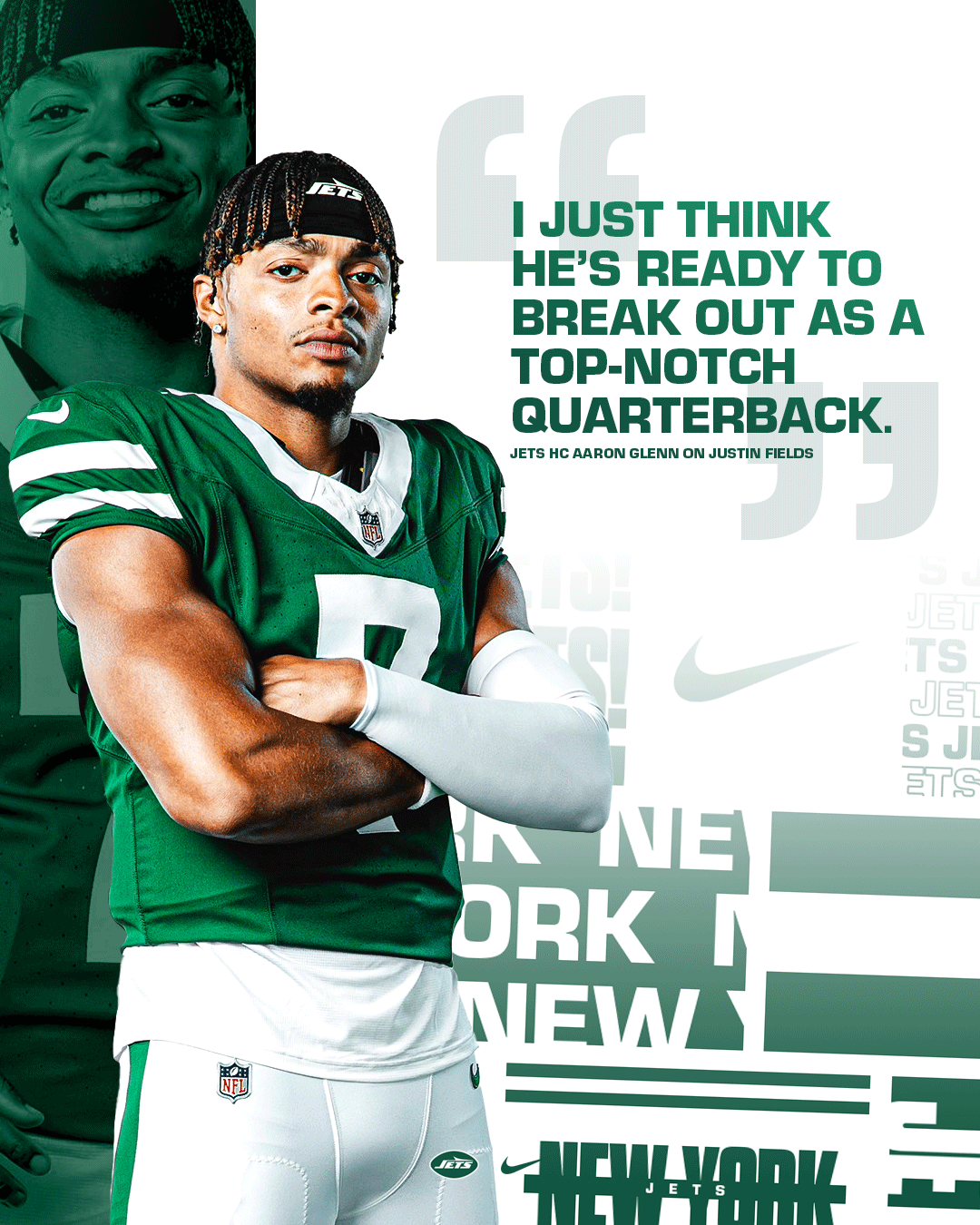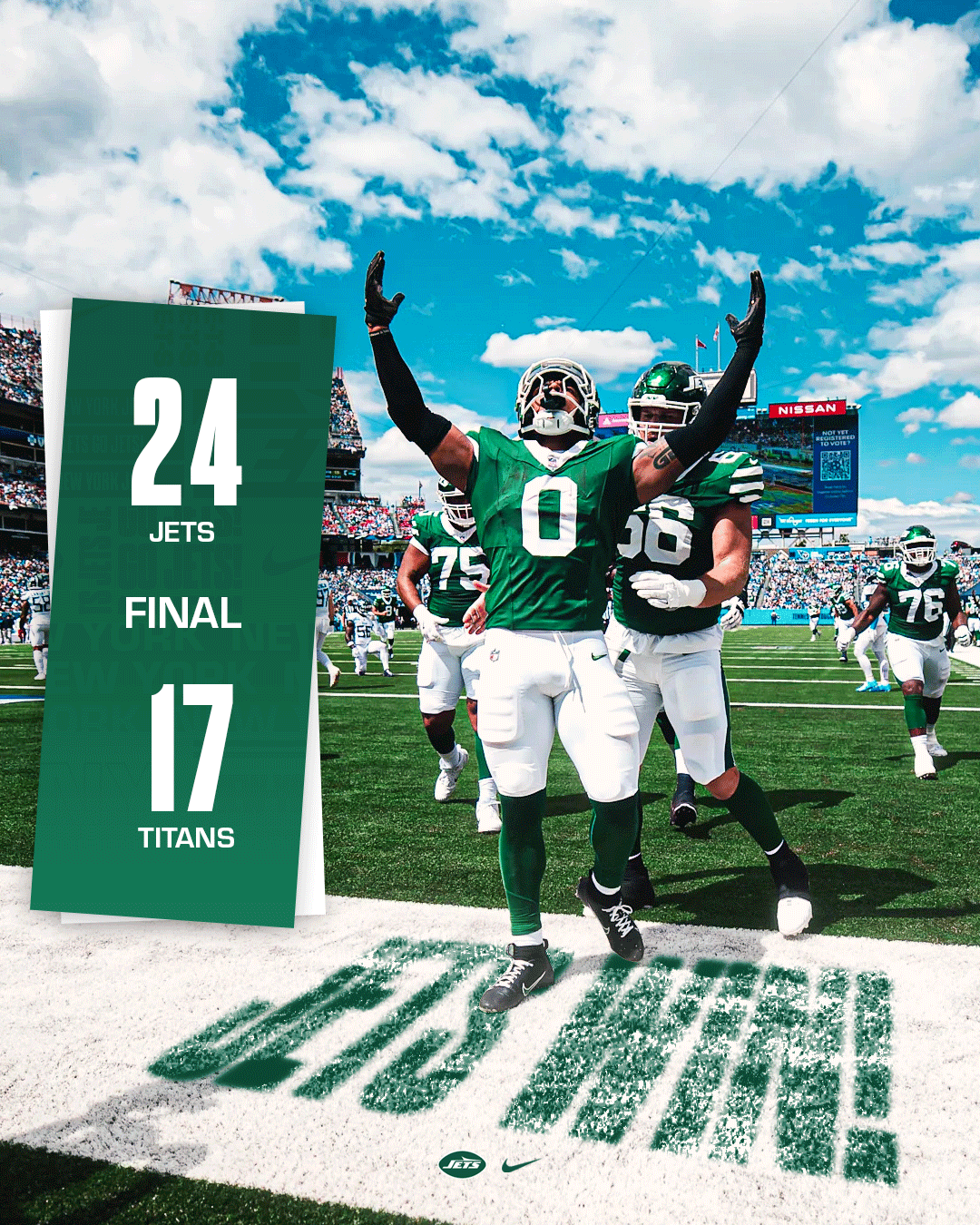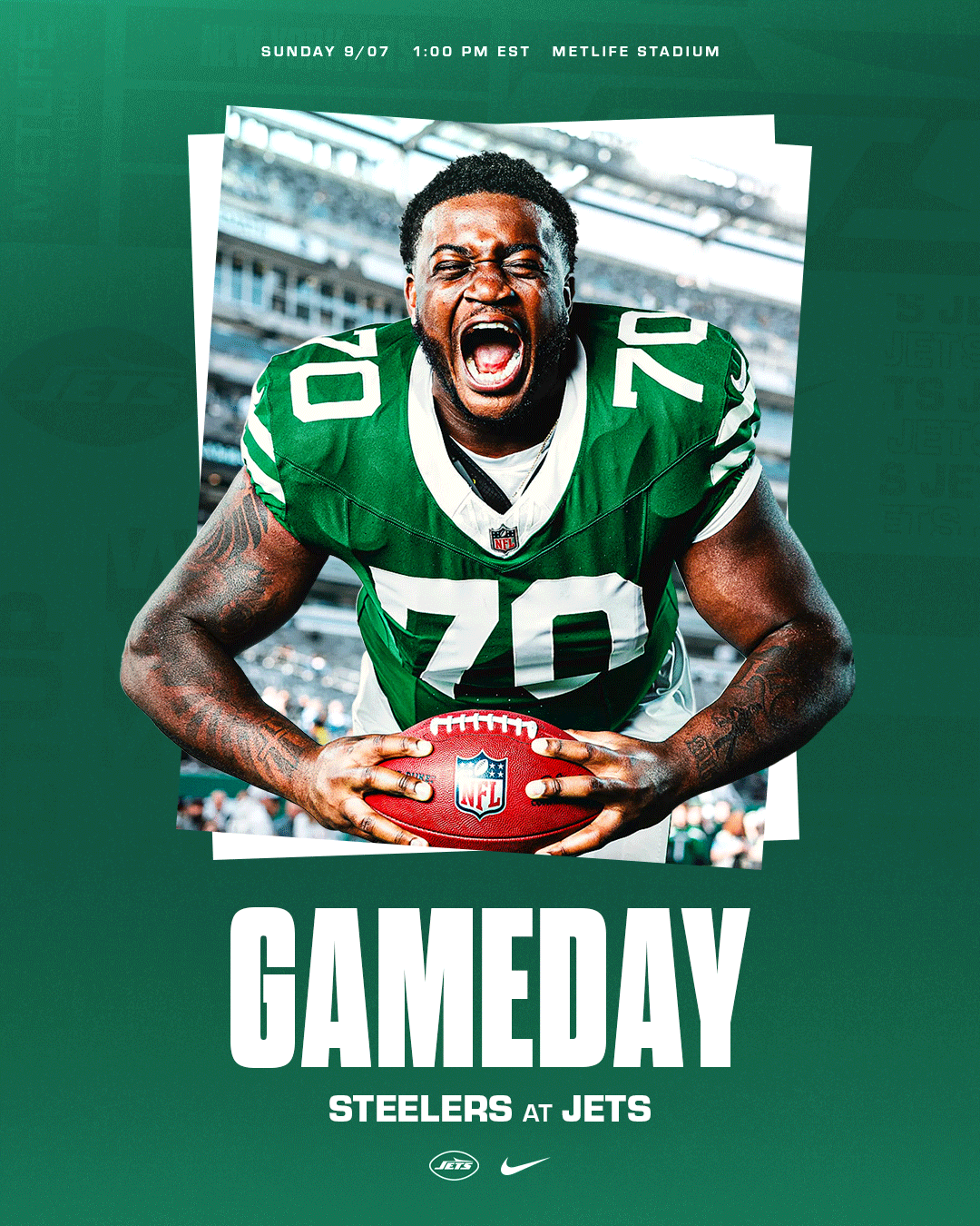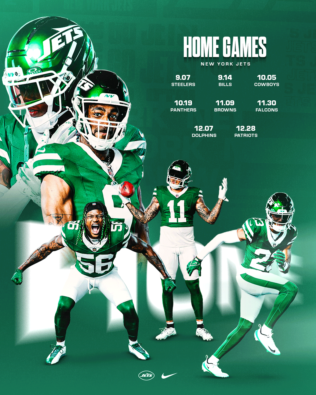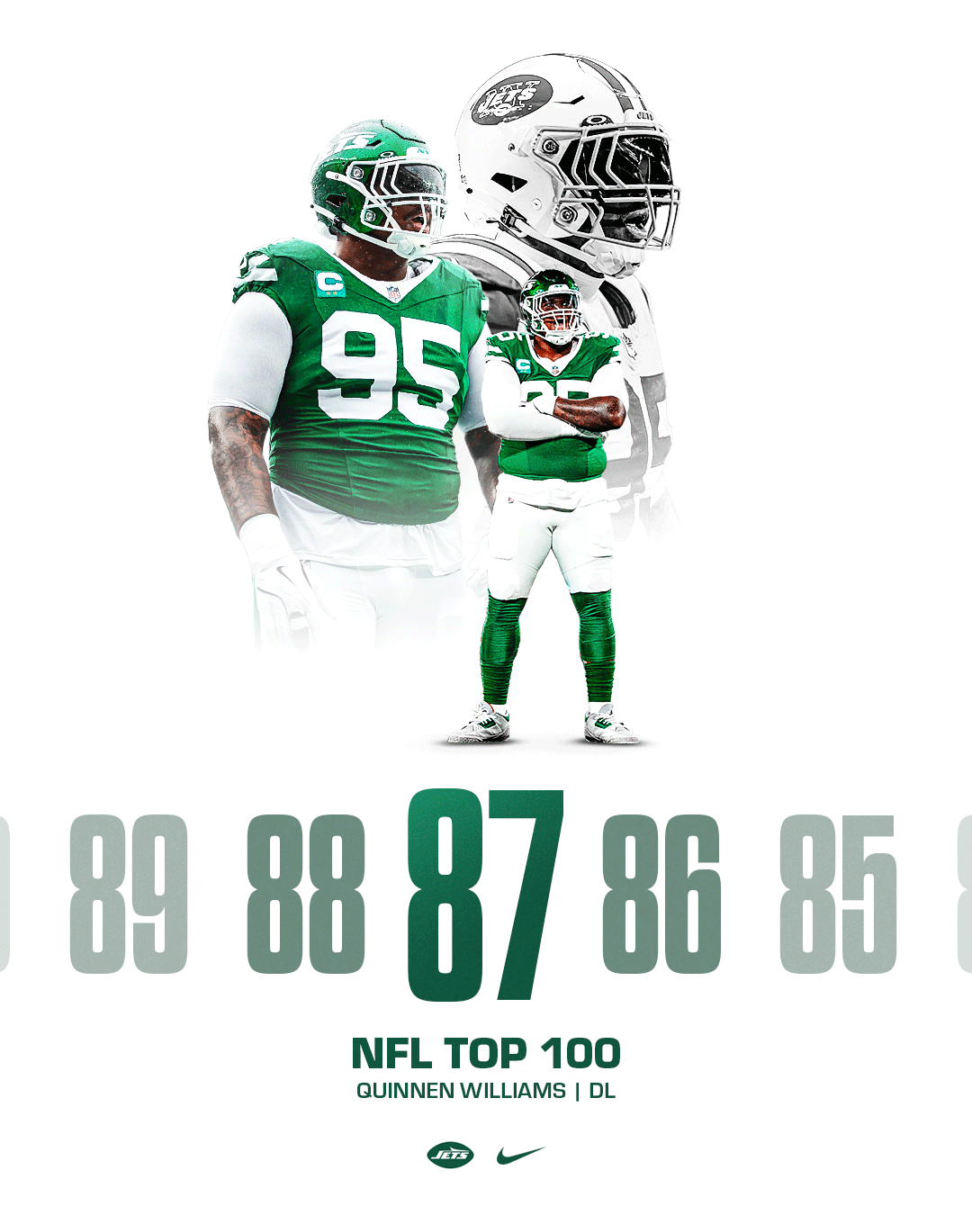This personal project explores a refreshing and exciting aesthetic for New York Jets social media graphics. I focused on developing a cohesive visual system across the designs while ensuring each graphic remained engaging. The project aimed to balance simple and more complex designs to create contrast based on the message being communicated. The photos used were sourced from photo galleries on the New York Jets’ official website.